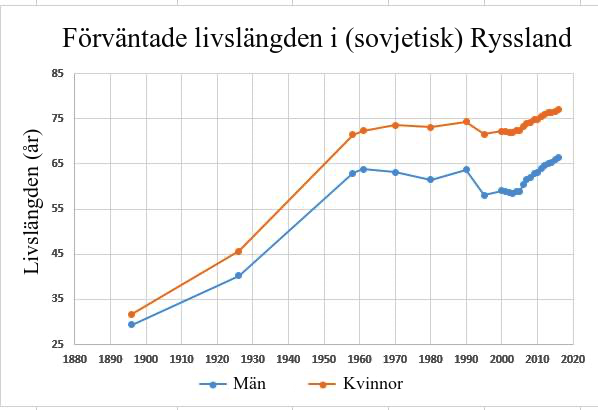 En bra indikator på ekonomisk succé eller misslyckande kan vara förväntad livslängd bland befolkningen. När Gorbatjov kom till makt 1985 var livslängden för män i Sovjet 65 år och 74 år för kvinnor. I slutet av 1990-talet – drygt ett årtionde senare – hade den genomsnittliga livslängden sjunkit till 59 år (!) för män och 70 år för kvinnor. (I jämförelse ökade livslängden ständigt under hela Sovjetperioden – under bara Stalin växte medellivslängden från 43 år 1929 till 69 år 1955.) Under 1990-talet ökade dödligheten i Ryssland med 30% medan födelsetalen föll. Det beräknas att mellan 1-2 miljoner överflödiga dödsfall orsakades av Gorbatjovs och Jeltsin kapitalistiska ”chockterapi”.
